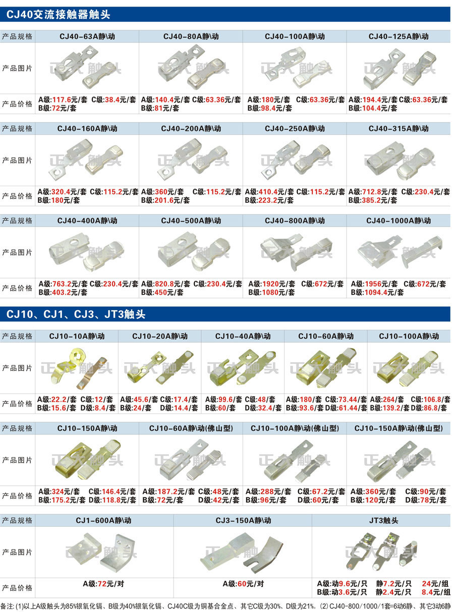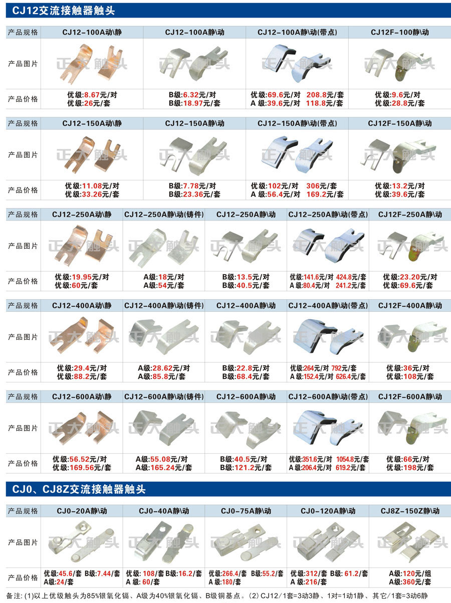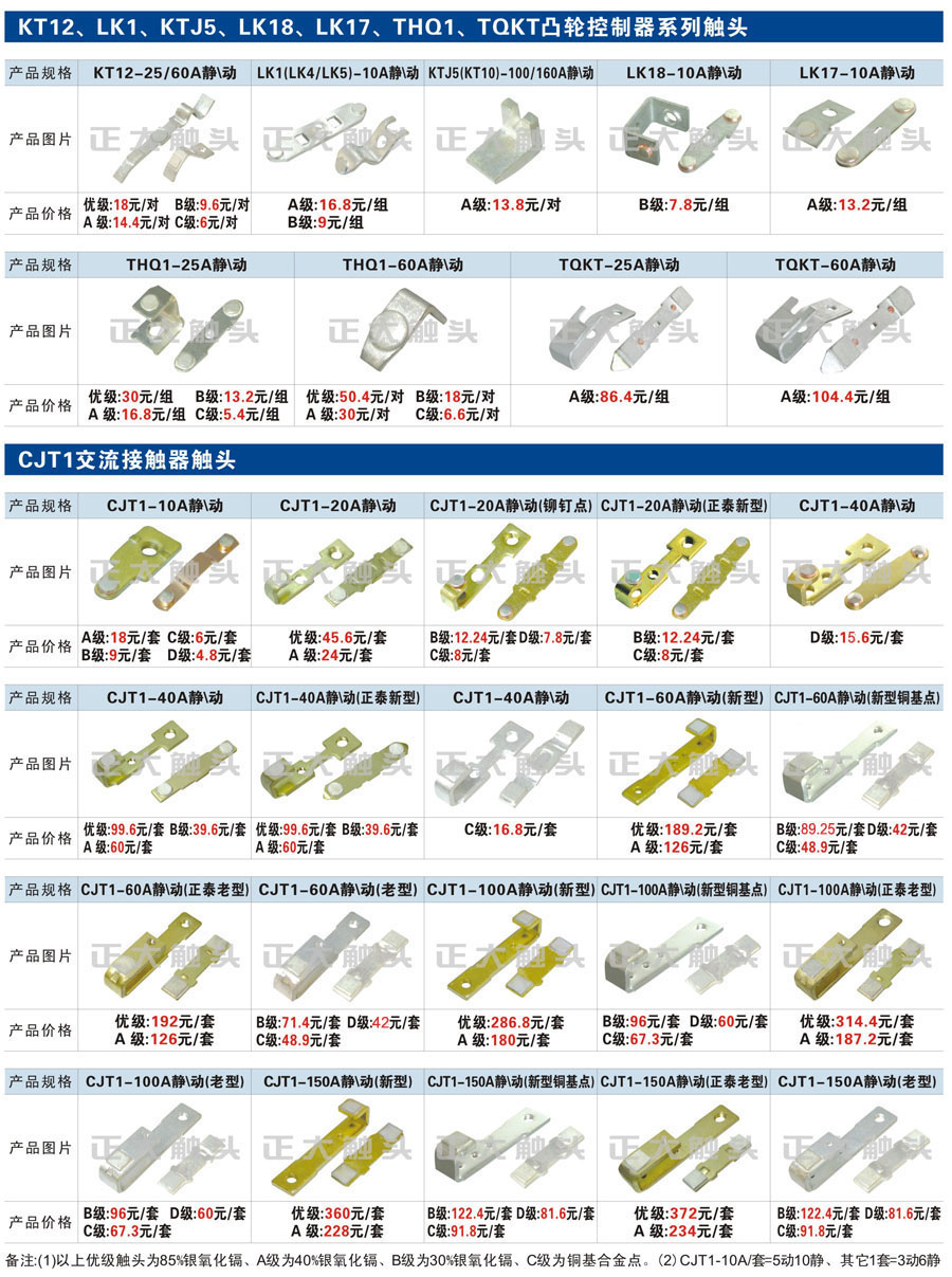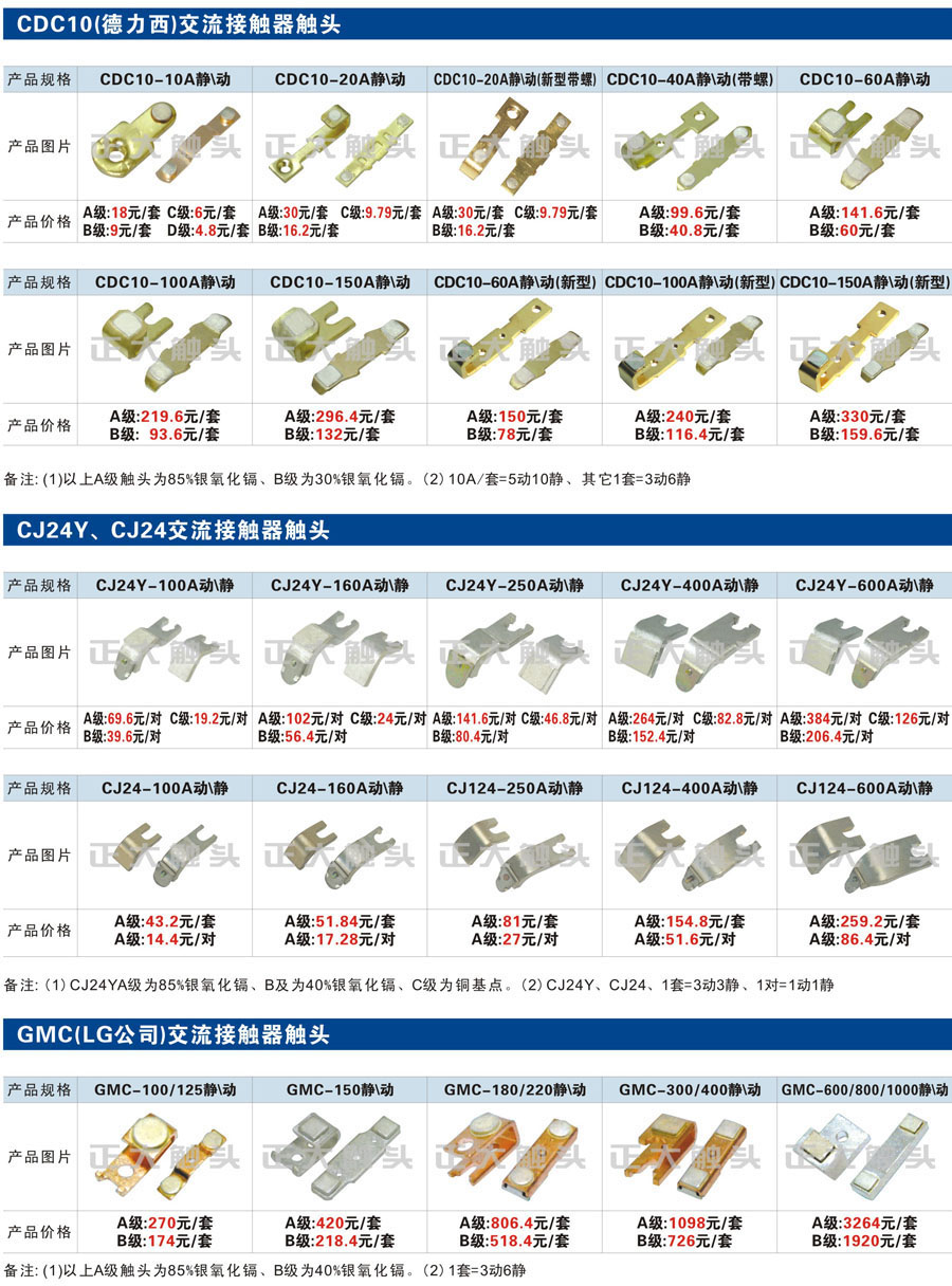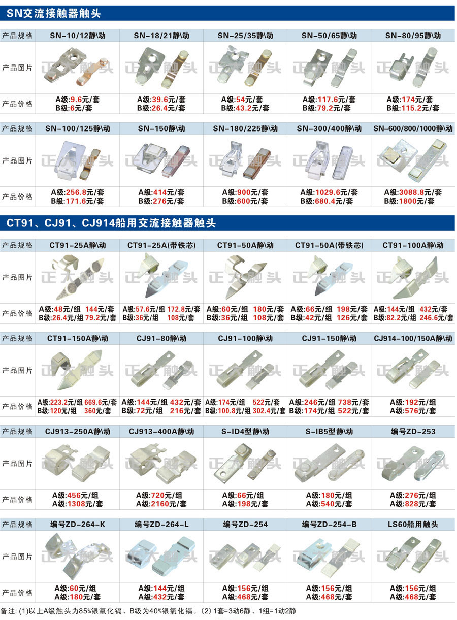 觸頭元件作為電器開關(guān)核心元件,主要用于接觸器,繼電器,斷路器,凸輪控制器,補(bǔ)償器,行程開關(guān),腳踏開關(guān),輔助開關(guān)等。正火電氣現(xiàn)生產(chǎn)CJT1,CJX1,CJX2,CJX4,CJX5,CJX8(B系列)CJ20,CJ40,CJ12,CJ15,CJ24,CJ24Y,CJ0,CDC10,CJ91,CT91,CJ913,CJ914,CJ3,CJ8Z交流接觸器觸頭,CZ0,CZ1,CZ3,CZ17,CZ18,CG5直流接觸器觸頭,QJ3,QC83補(bǔ)償器觸頭,凸輪控制器,主令觸頭,KT10,KT12,KT14,KTJ1,KTJ5,KTJ6,KTJ15(QT5),LK1,LK17,LK18,THQ1,TQKT等;斷路器觸頭DW10,DW16,DW15,DW17,DW45,DZ10,DZ20,內(nèi)燃機(jī)觸頭,礦用觸頭,叉車,吊車觸頭,JYN1,JYN2,ZN28,SN10,VS1,梅花觸頭等。進(jìn)口ABB系列AF,EH,EK,富士SC系列,日立H系列,施耐德LC1系列,西門子3TF,3TB系列,LG公司(LS產(chǎn)電)GMC系列,三菱機(jī)電SN系列。與國(guó)內(nèi)正泰,德力西,天正,人民等,國(guó)外ABB,施耐德,西門子,富士,三菱等廠家電氣配套。