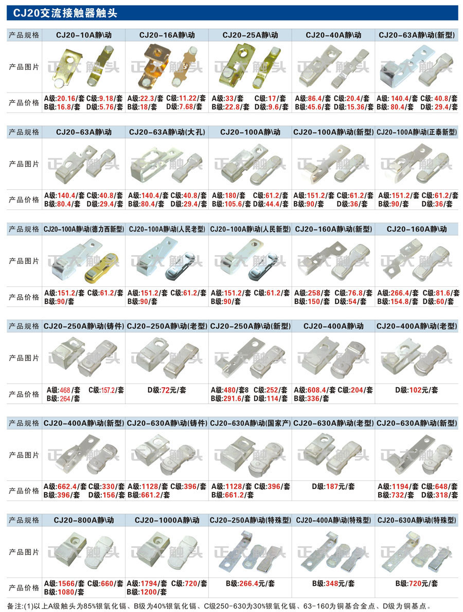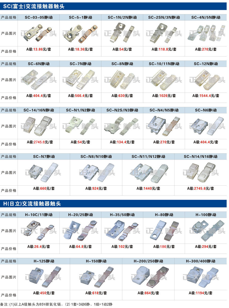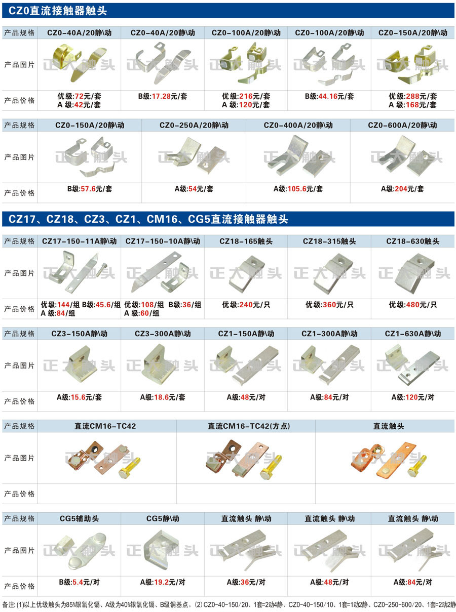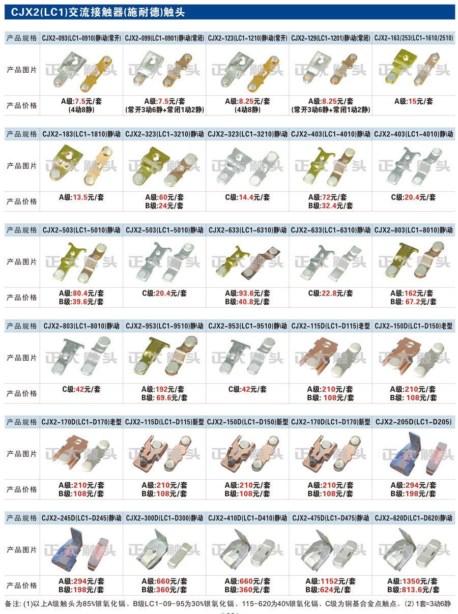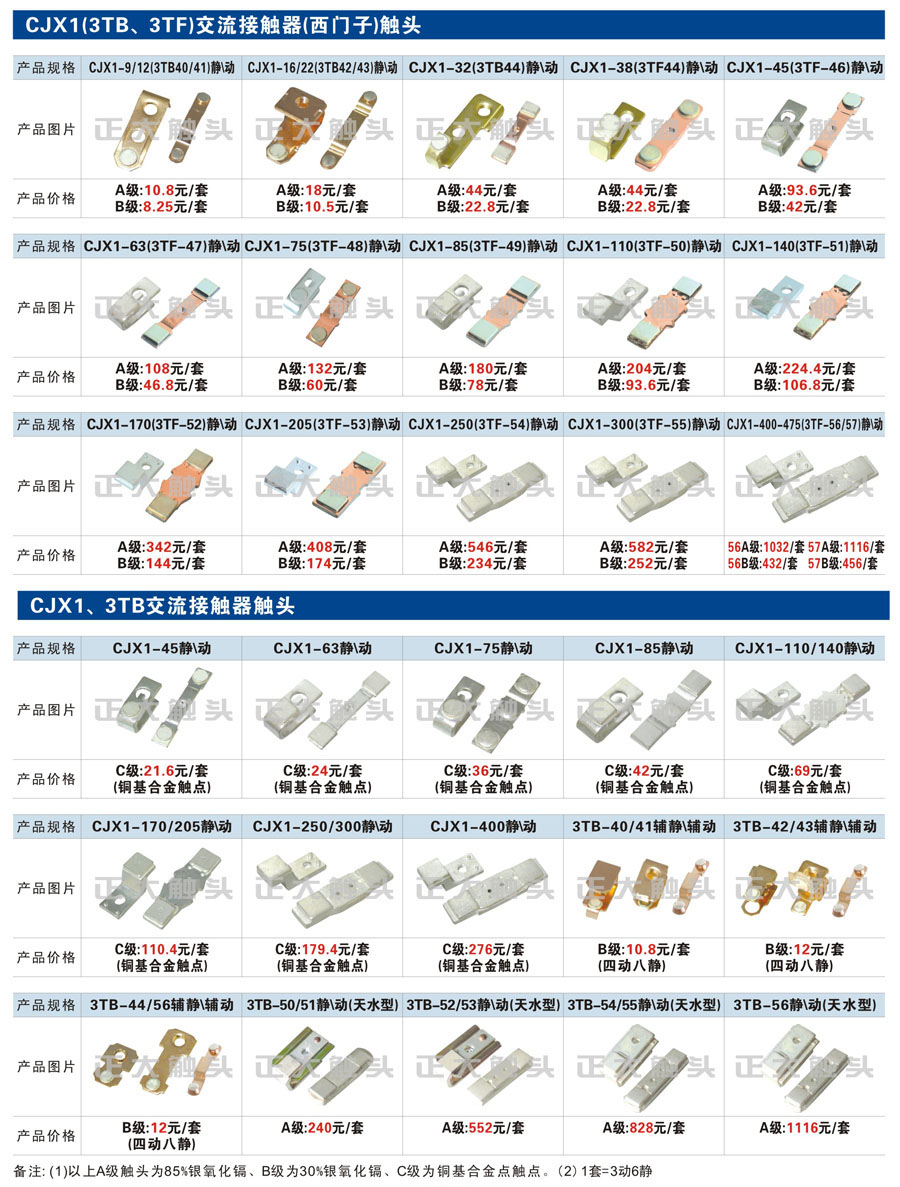 觸頭元件作為電器開關(guān)核心元件,主要用于接觸器,繼電器,斷路器,凸輪控制器,補(bǔ)償器,行程開關(guān),腳踏開關(guān),輔助開關(guān)等。正火電氣現(xiàn)生產(chǎn)CJT1,CJX1,CJX2,CJX4,CJX5,CJX8(B系列)CJ20,CJ40,CJ12,CJ15,CJ24,CJ24Y,CJ0,CDC10,CJ91,CT91,CJ913,CJ914,CJ3,CJ8Z交流接觸器觸頭,CZ0,CZ1,CZ3,CZ17,CZ18,CG5直流接觸器觸頭,QJ3,QC83補(bǔ)償器觸頭,凸輪控制器,主令觸頭,KT10,KT12,KT14,KTJ1,KTJ5,KTJ6,KTJ15(QT5),LK1,LK17,LK18,THQ1,TQKT等;斷路器觸頭DW10,DW16,DW15,DW17,DW45,DZ10,DZ20,內(nèi)燃機(jī)觸頭,礦用觸頭,叉車,吊車觸頭,JYN1,JYN2,ZN28,SN10,VS1,梅花觸頭等。進(jìn)口ABB系列AF,EH,EK,富士SC系列,日立H系列,施耐德LC1系列,西門子3TF,3TB系列,LG公司(LS產(chǎn)電)GMC系列,三菱機(jī)電SN系列。與國(guó)內(nèi)正泰,德力西,天正,人民等,國(guó)外ABB,施耐德,西門子,富士,三菱等廠家電氣配套。