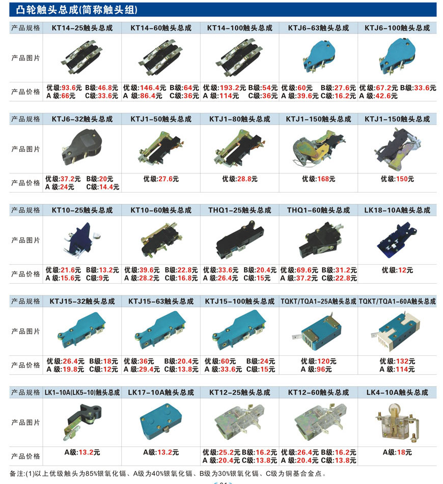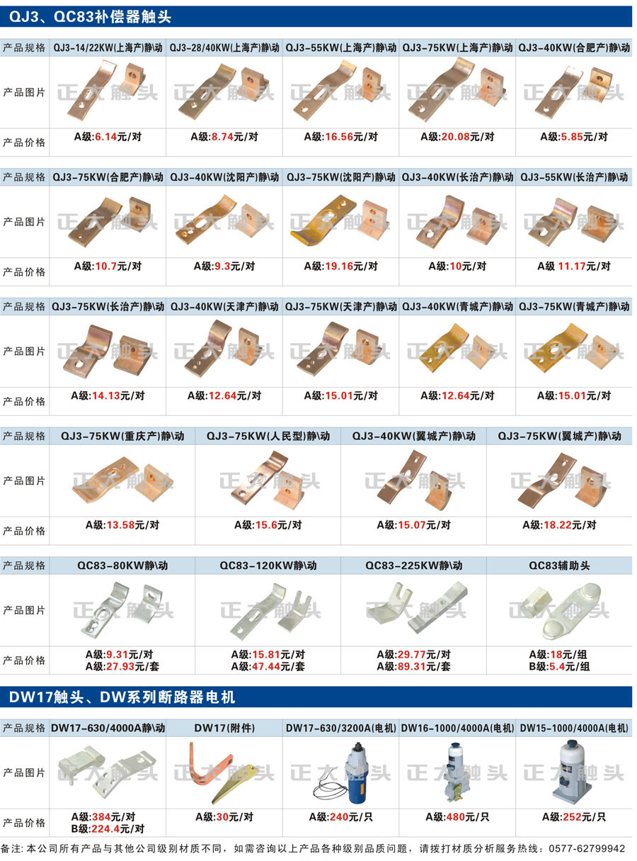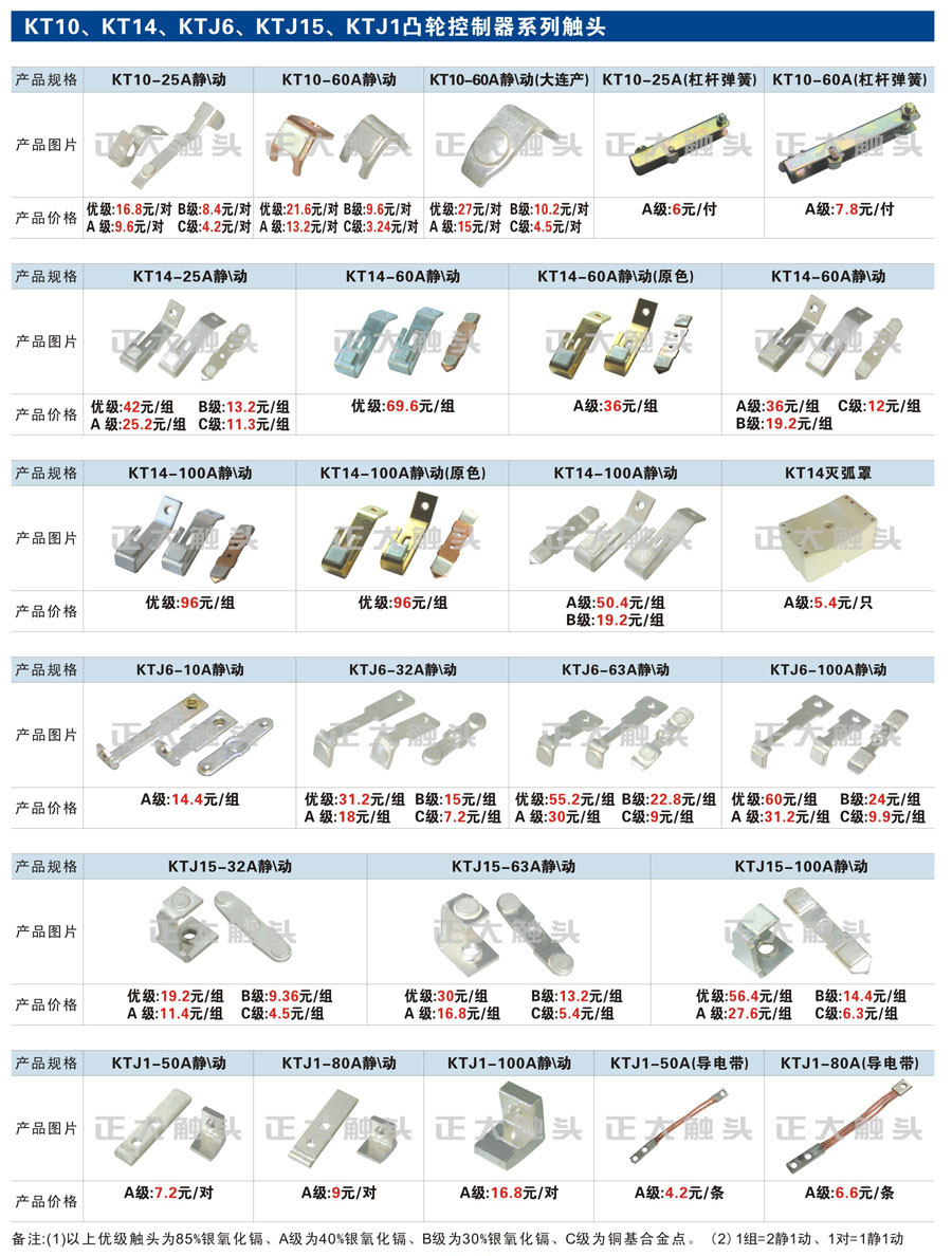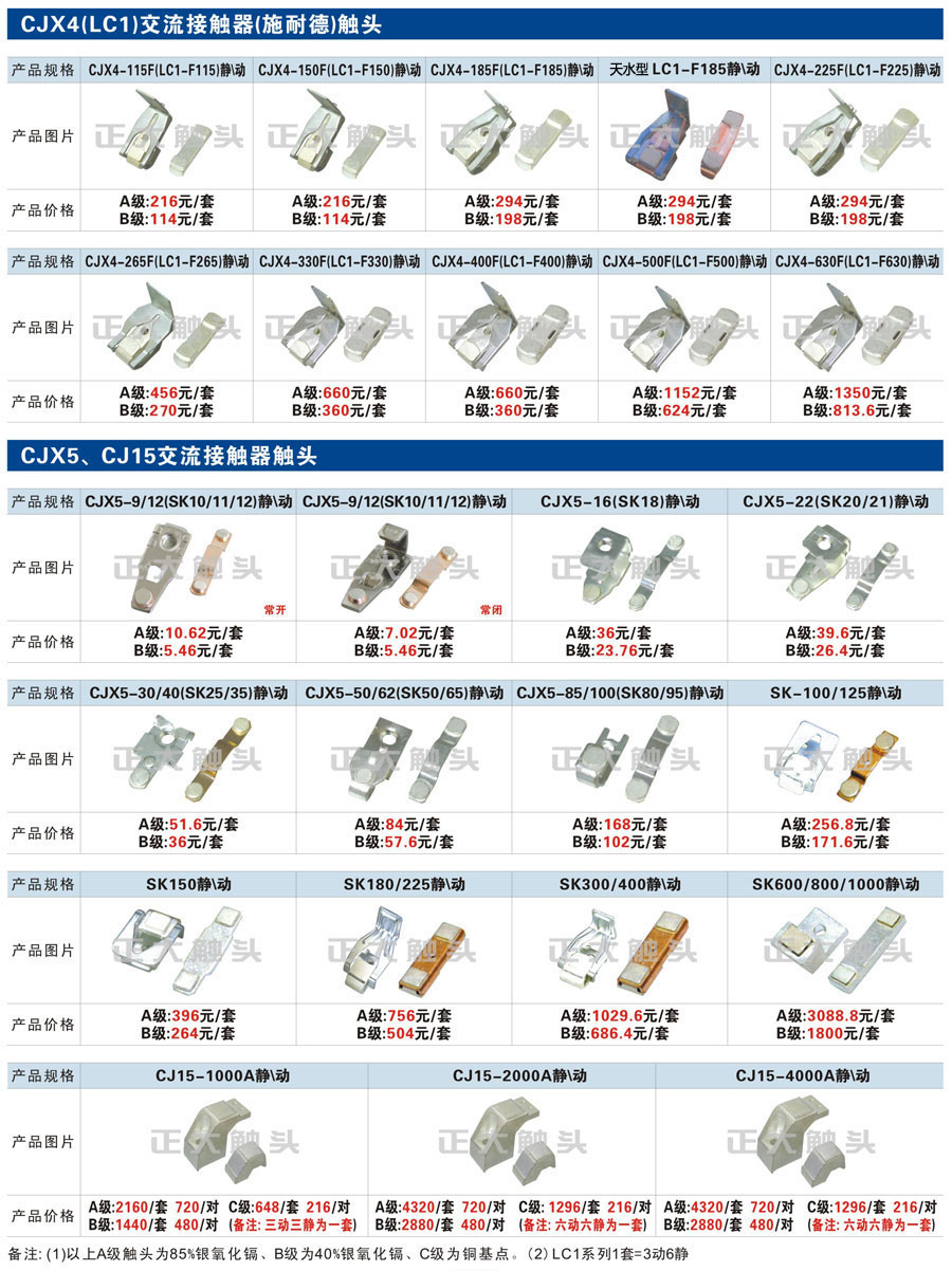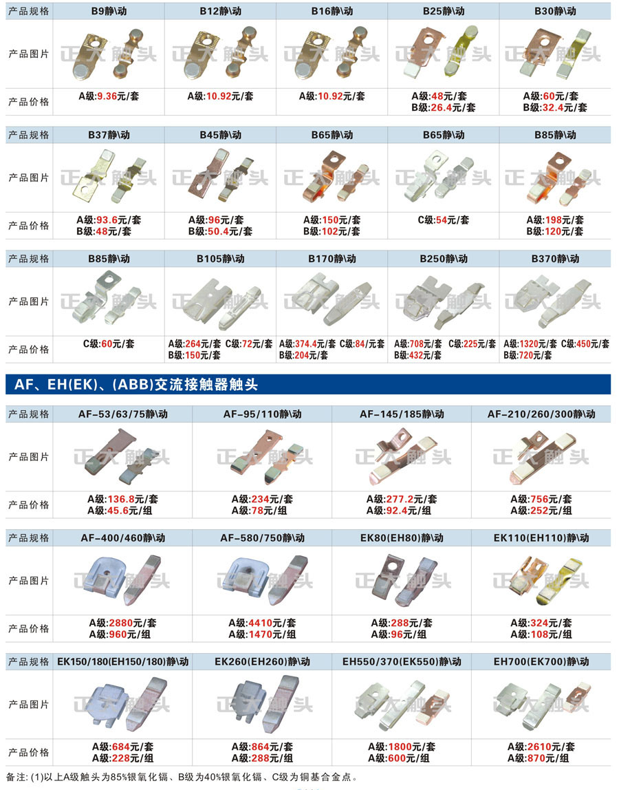 觸頭元件作為電器開關(guān)核心元件,主要用于接觸器,繼電器,斷路器,凸輪控制器,補(bǔ)償器,行程開關(guān),腳踏開關(guān),輔助開關(guān)等。正火電氣現(xiàn)生產(chǎn)CJT1,CJX1,CJX2,CJX4,CJX5,CJX8(B系列)CJ20,CJ40,CJ12,CJ15,CJ24,CJ24Y,CJ0,CDC10,CJ91,CT91,CJ913,CJ914,CJ3,CJ8Z交流接觸器觸頭,CZ0,CZ1,CZ3,CZ17,CZ18,CG5直流接觸器觸頭,QJ3,QC83補(bǔ)償器觸頭,凸輪控制器,主令觸頭,KT10,KT12,KT14,KTJ1,KTJ5,KTJ6,KTJ15(QT5),LK1,LK17,LK18,THQ1,TQKT等;斷路器觸頭DW10,DW16,DW15,DW17,DW45,DZ10,DZ20,內(nèi)燃機(jī)觸頭,礦用觸頭,叉車,吊車觸頭,JYN1,JYN2,ZN28,SN10,VS1,梅花觸頭等。進(jìn)口ABB系列AF,EH,EK,富士SC系列,日立H系列,施耐德LC1系列,西門子3TF,3TB系列,LG公司(LS產(chǎn)電)GMC系列,三菱機(jī)電SN系列。與國(guó)內(nèi)正泰,德力西,天正,人民等,國(guó)外ABB,施耐德,西門子,富士,三菱等廠家電氣配套。